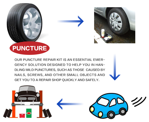 ・No need to remove the valve core ・Automatic injection of repair fluid and air ・Easy to operate ・No ability to boost air alone |